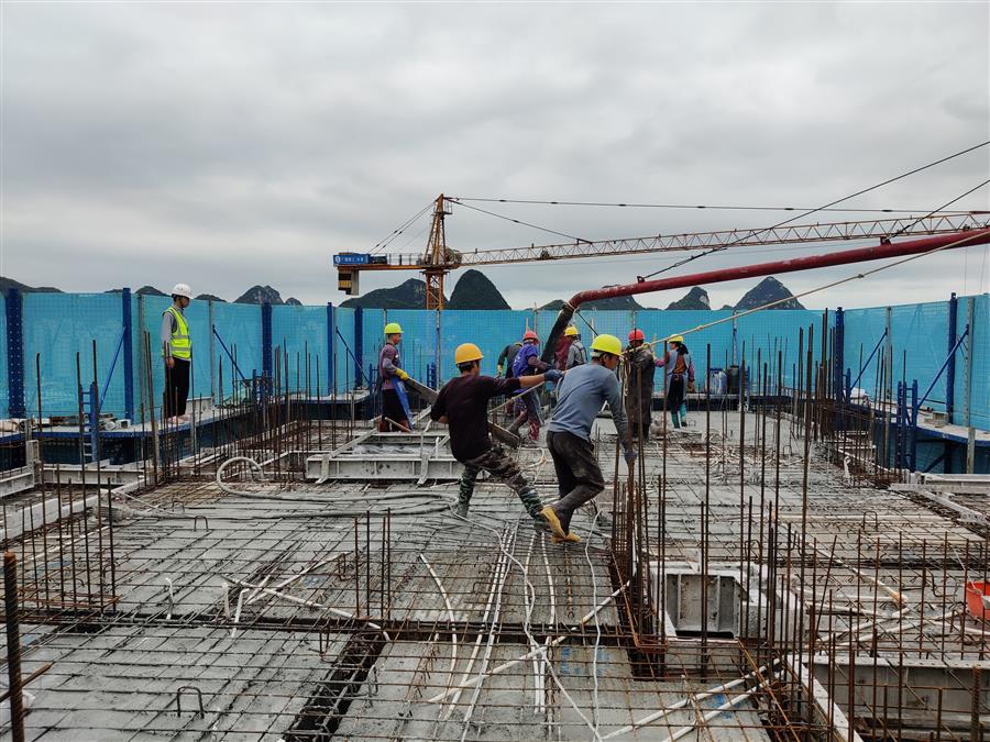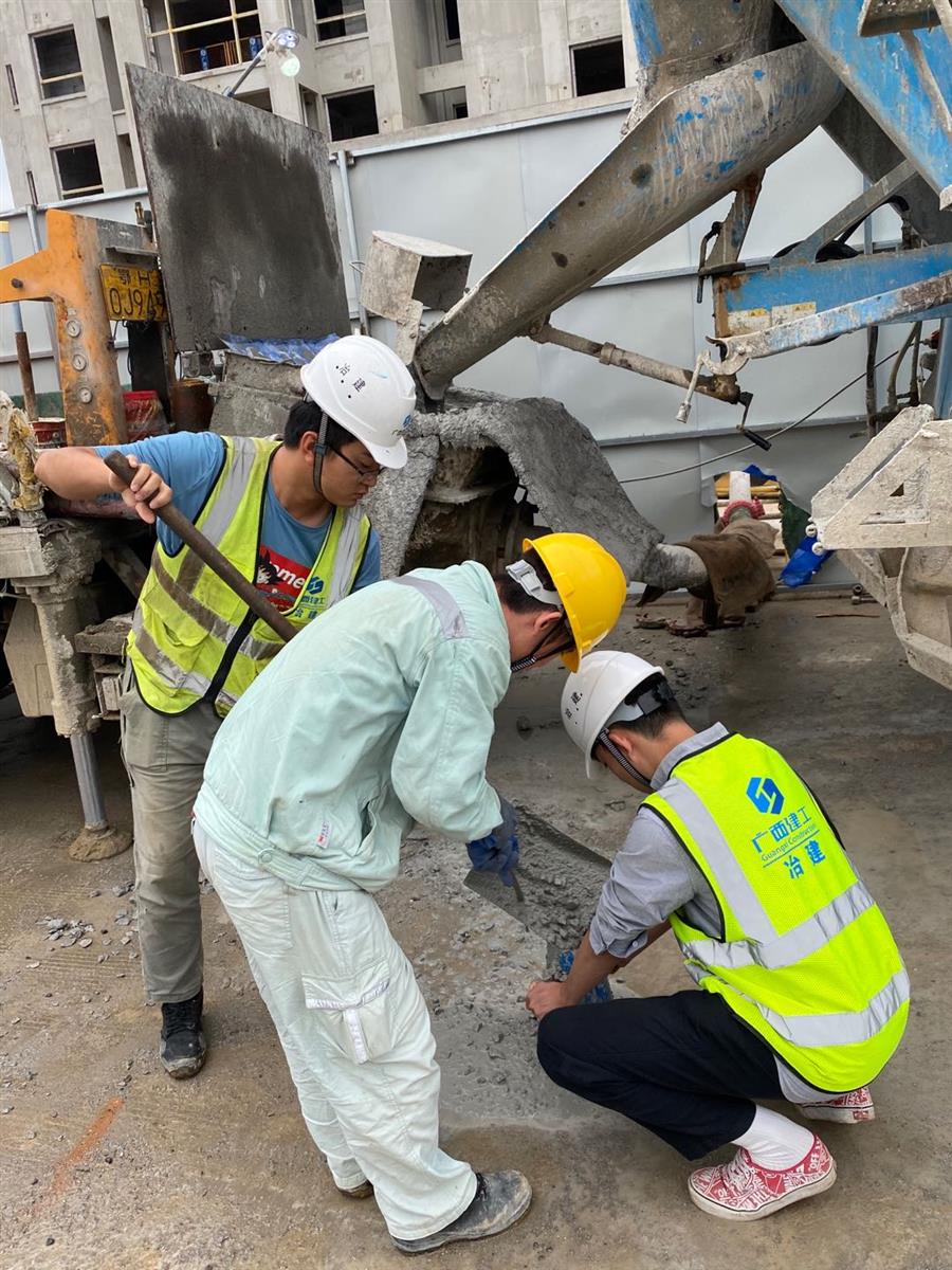 馬達聲、電鉆聲轟鳴,混凝土攪拌車、混凝土泵車、材料運輸板車、土方綠皮車來往穿梭,綁扎鋼筋、混凝土塌落度試驗、澆筑混凝土、升爬架前驗收等工作有條不紊進行,這是第四分公司融創江南林語項目的趕工現場。