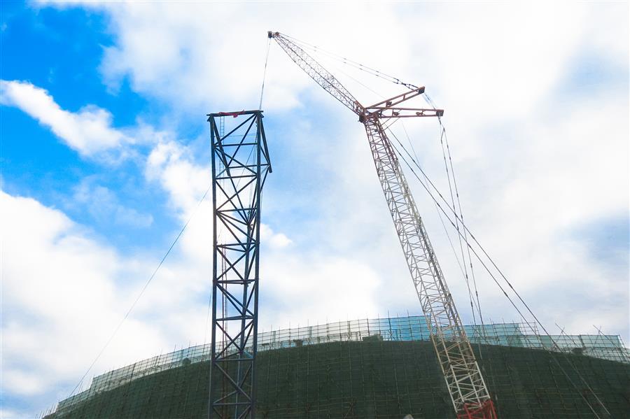 靖西市乒乓主題體育公園鋼結構罩棚空間桁架采用三角桁架形式,桁架柱向外傾斜,與地面夾角呈65°,重量達25噸,桁架柱即徑向桁架為三角管桁架,整體結構呈倒L形,根據其受力特點可分為懸挑式和前端支承式,懸挑式根部設置撐桿,撐桿連接在看臺勁性柱上。此次桁架吊裝難度大、技術要求高,項目部從構件進場、精準定位、吊裝,每一道工序、每一個環節都實行全過程無縫隙標準化管理,全力確保安裝和細節符合技術要求。