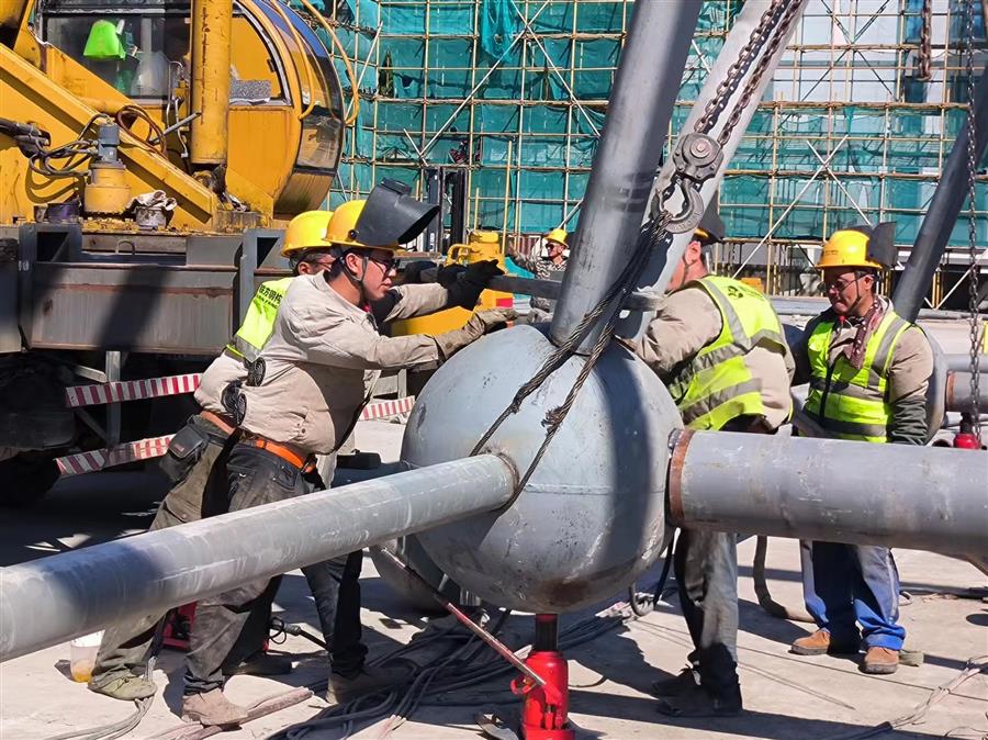 項目總建筑面積4.46萬平方米,建設內容為文化會展中心和英德茶文化博物館(含紅茶研發中心、檢測中心和交易中心)等。目前,項目正在進行網架拼裝、加焊、焊接囗打磨、鋼球刷漆等工作,鋼結構施工進度為65%。