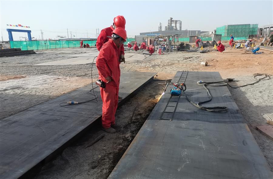 為了保障工程進度,在確保安全和質量的前提下,建設者們日夜奮戰在項目工地,全力加快項目建設。目前,項目整體進度完成55%,廠房配套臨建主體設施完成65%,1500方儲油罐體焊接已完成10個,完成項目整體罐體焊接55%。剩余工藝管道配套管網正在場外工廠緊鑼密鼓地進行生產加工,隨后運到廠區進行拼接組裝。